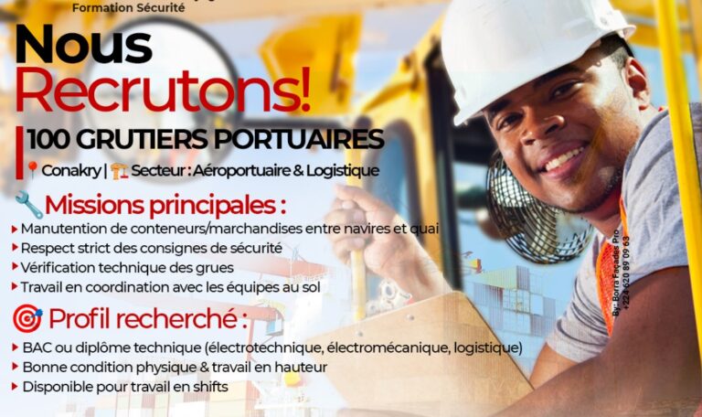 Grutier Description du poste Fonction : Opérateur de grue mobile portuaire Type de contrat : CDD/CDI Lieu de travail : Conakry Description de la mission Mission globale du poste..